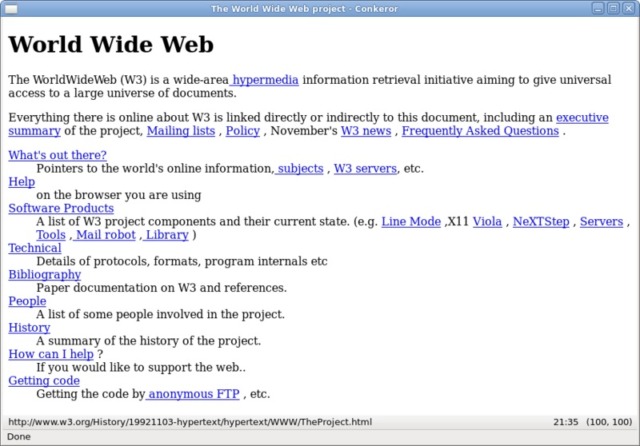 La pagina fungeva da indice centrale per il progetto “WorldWideWeb”. Era composta interamente da testo, senza immagini, colori o grafica, e conteneva collegamenti (hyperlink) ad altri documenti informativi, tra cui: