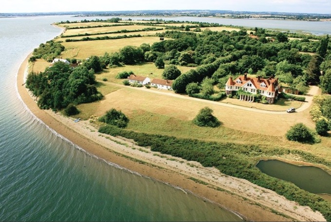 “Un’imponente e storica tenuta su un’isola privata, a circa 40 miglia dal centro di Londra, con proprietà in vendita a titolo di piena proprietà.